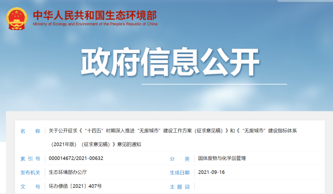 最新 | 生態(tài)環(huán)境部:對《“十四五”時(shí)期深入推進(jìn)“無廢城市”建設(shè)工作方案》和《“無廢城市”建設(shè)指標(biāo)體系(2021年版)》征求意見