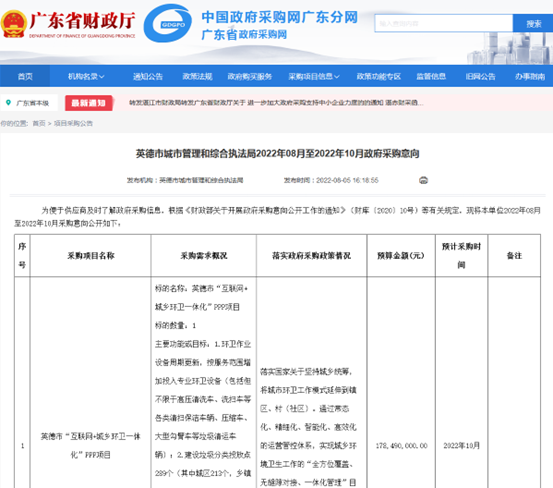 圖片來源:廣東省政府采購廣東省政府采購網(wǎng)消息,近日,英德市城市管理和綜合執(zhí)法局發(fā)布2022年08月至2022年10月政府采購意向,英德市“互聯(lián)網(wǎng)+城鄉(xiāng)環(huán)衛(wèi)一體化”PPP項(xiàng)目計(jì)劃于2022年10月份開展政府采購。采購需求概況:1.環(huán)衛(wèi)作業(yè)設(shè)備周期更新,按服務(wù)范圍增加投入專業(yè)環(huán)衛(wèi)設(shè)備(包括但不限于高壓清...