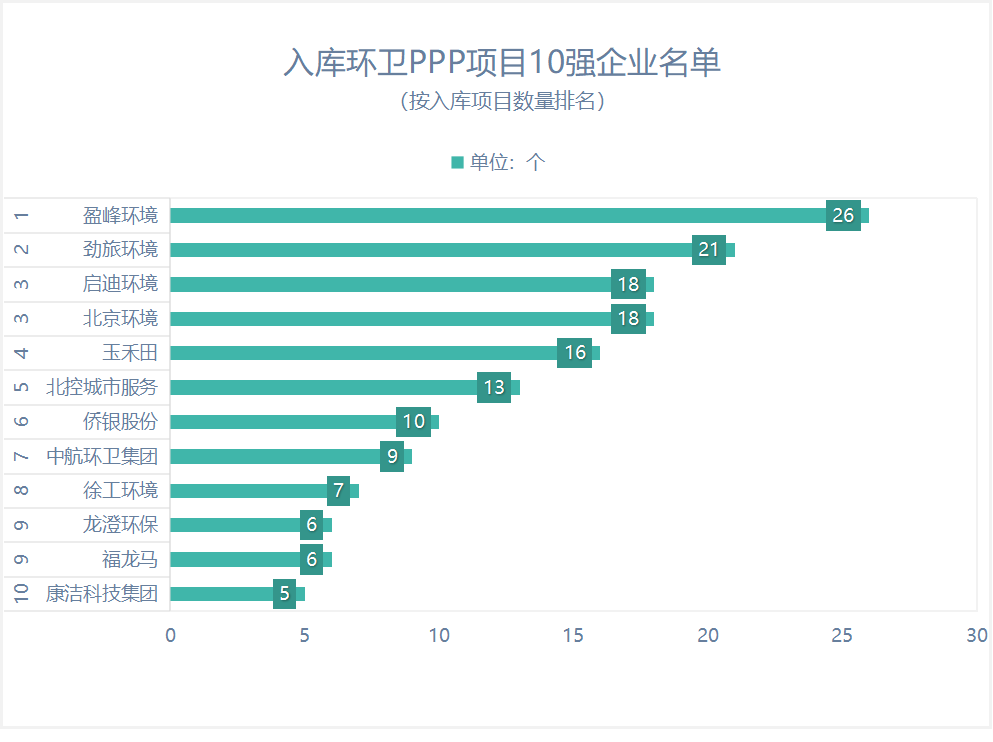 已入庫環(huán)衛(wèi)PPP項(xiàng)目領(lǐng)域,誰是最大贏家?入庫項(xiàng)目:財(cái)政部政府和社會(huì)資本合作中心PPP項(xiàng)目庫可以查詢到的項(xiàng)目,包括項(xiàng)目管理庫和項(xiàng)目?jī)?chǔ)備清單。截止目前,已入庫、且已開標(biāo)的環(huán)衛(wèi)PPP項(xiàng)目總量為302個(gè)。按項(xiàng)目量計(jì)算,盈峰環(huán)境占入庫項(xiàng)目總量的12%在302個(gè)入庫且已開標(biāo)環(huán)衛(wèi)PPP項(xiàng)目中,盈峰環(huán)境入庫項(xiàng)目數(shù)量...