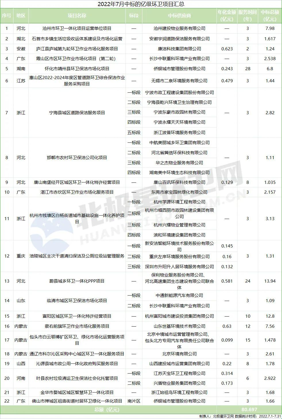 7月共開出2個(gè)10億+項(xiàng)目,分別是13.94億元的河北蔚縣城鄉(xiāng)環(huán)衛(wèi)一體化PPP項(xiàng)目和12.8億元的浙江富陽區(qū)城區(qū)環(huán)衛(wèi)一體化特許經(jīng)營項(xiàng)目,這兩個(gè)項(xiàng)目分別被保利物業(yè)、河北高速聯(lián)合體以及杭州富陽城投收入囊中。項(xiàng)目匯總?cè)缦拢?1 河北、浙江、廣東三地仍然領(lǐng)先內(nèi)蒙古地區(qū)異軍突起眾所周知,河北、浙江、廣東地區(qū)環(huán)...