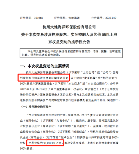 生活垃圾分類回收“藍(lán)?!闭絹碓蕉嘤袑?shí)力的公司競(jìng)逐。8月17日,大地海洋(301068.SZ)披露重大資產(chǎn)重組草案,公司擬通過發(fā)行股份的方式,向唐偉忠、九寅合伙、張杰來、唐宇陽、藍(lán)貝星悅、金曉錚、城田創(chuàng)業(yè)和城卓創(chuàng)業(yè)購買其合計(jì)持有的虎哥環(huán)境100%股權(quán),交易價(jià)格為9.1億元;同時(shí)擬向合計(jì)不超過35...