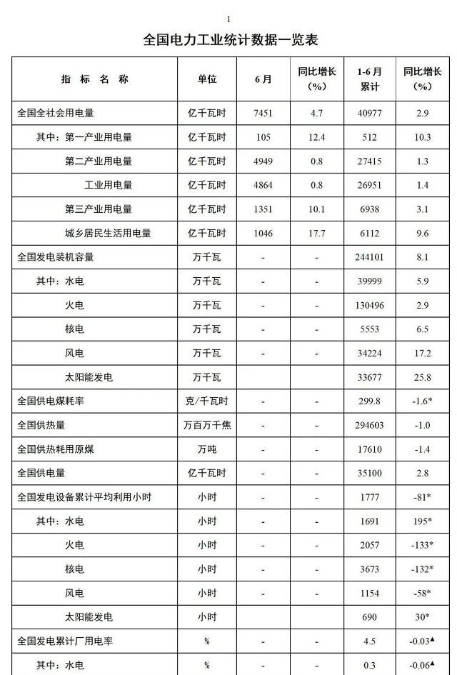 7月19日,國家能源局發(fā)布1-6月份全國電力工業(yè)統(tǒng)計數(shù)據(jù)。截至6月底,全國發(fā)電裝機容量約24.4億千瓦,同比增長8.1%。其中,風(fēng)電裝機容量約3.4億千瓦,同比增長17.2%;太陽能發(fā)電裝機容量約3.4億千瓦,同比增長25.8%。 1-6月份,全國發(fā)電設(shè)備累計平均利用1777小時,比上年同期減少81...