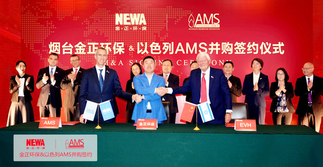 儀式上,在煙臺市政府領導、煙臺市環(huán)保局領導、煙臺市萊山區(qū)領導及長期以來支持金正環(huán)保的金融界等合作伙伴共同見證下金正環(huán)保總裁李越彪先生、AMS公司原股東Johannes Sittard博士以及AMS公司CEO Gil Meron成功簽訂并購協(xié)議。