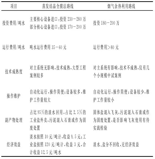 蒸發(fā)結(jié)晶全膜法工藝路線與煙氣余熱利用工藝路線比選。煙氣余熱利用廢水零排放是近來(lái)比較熱的技術(shù),經(jīng)常拿來(lái)跟蒸發(fā)結(jié)晶式零排放工藝相提并論,但它不能實(shí)現(xiàn)水資源和鹽資源的回收和再利用。2種工藝路線比較結(jié)果,見表2。