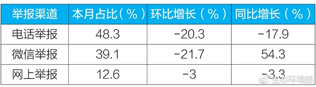 2018年11月,全國接到的舉報(bào)中,“12369”環(huán)保舉報(bào)熱線電話共24998件,約占48.3%,微信舉報(bào)20227件,約占39.1%,網(wǎng)上舉報(bào)6499件,約占12.6%。其中,電話舉報(bào)、網(wǎng)上舉報(bào)同比均有所下降,微信舉報(bào)同比增長54.3%。