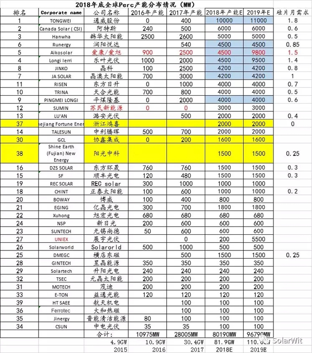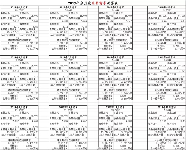 這個(gè)表格中的數(shù)據(jù)需要做一個(gè)說明,根據(jù)對(duì)供應(yīng)鏈的追蹤:12月當(dāng)月Perc的有效電池產(chǎn)能為60GW,并沒有達(dá)到圖中所說的81.9GW,這是因?yàn)閺你懪飘a(chǎn)能到有效產(chǎn)出還需要一個(gè)調(diào)試的過程。當(dāng)前有很多新建和技改的電池產(chǎn)能正在調(diào)試的路上,預(yù)期2019年3月份末會(huì)達(dá)產(chǎn),屆時(shí)每月對(duì)單晶硅片的需求量會(huì)達(dá)到12.1億片。