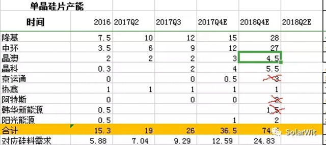 上面這張截圖是2017年年底總結(jié)的,現(xiàn)在回顧他發(fā)現(xiàn)基本不用修改,因?yàn)闆]有新增的進(jìn)入者,反倒是有幾家公司并沒有如期達(dá)產(chǎn);京運(yùn)通原本計(jì)劃中的3GW產(chǎn)能現(xiàn)在也沒有蹤影;阿特斯之前拋出了雄心勃勃的計(jì)劃,但實(shí)際上目前只有24臺(tái)單晶爐做中試線;韓華新能源也同樣,并沒有有效產(chǎn)能出來,依然需要通過外部采購(gòu)。當(dāng)前市場(chǎng)中有效的單晶硅片產(chǎn)能實(shí)際上只有四家但是由于晶科、晶澳只自用不外供,所以對(duì)于市場(chǎng)上第三方公開對(duì)外銷售的產(chǎn)能,有效供給只有兩家:隆基和中環(huán),在硅片環(huán)節(jié),迅速地形成了雙寡頭壟斷的產(chǎn)業(yè)格局。這是供給端,我們?cè)倏纯磫尉Ч杵男枨蠖耍?/div>