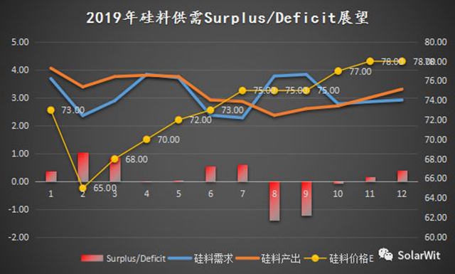 在44.3萬(wàn)噸需求假設(shè)下,2019年硅料供給平衡曲線為: