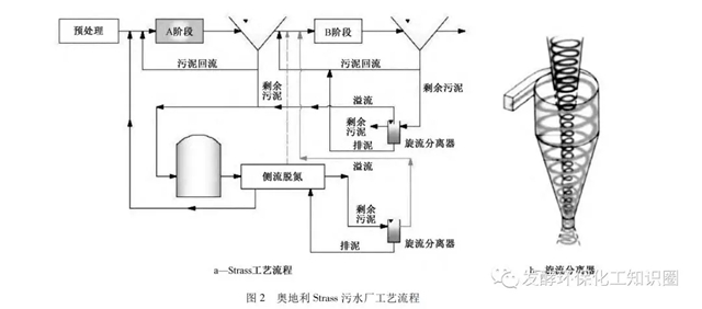 斯特拉斯污水處理廠以主流傳統(tǒng)工藝( AB法)與側(cè)流新型脫氮工藝( 厭氧氨氧化) 相結(jié)合的方式,運行工藝如圖2a所示??芍? 污水經(jīng)過預(yù)處理進(jìn)入A段吸附( adsorption) 去除有機(jī)物,可有效防止過高的有機(jī)物對厭氧氨氧化菌的抑制。之后污水進(jìn)入B段生物降解過程( biodegradation) ,即采用一體式厭氧氨氧化工藝脫氮。在A段吸附了大量有機(jī)物的污泥,經(jīng)過排泥、剩余污泥濃縮、厭氧消化和脫水等過程后,產(chǎn)生的污泥厭氧消化液和污泥脫水液氨氮濃度較高,采用側(cè)流厭氧氨氧化DEMON工藝脫氮。側(cè)流部分通過旋流分離器( 圖2b) 分離絮體( 主要是AOB)和顆粒污泥( 主要AnAOB) ,從而富集厭氧氨氧化菌。在主流工藝中,除了傳統(tǒng)方式的污泥回流外,還需要回流測流工藝的污泥實現(xiàn)對AOB和AnAOB生物強(qiáng)化。除此之外,該工藝還將部分污泥消化液定期回流至B階段,進(jìn)行氨氮負(fù)荷的調(diào)控。