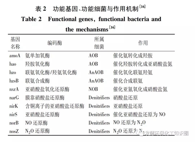 部分亞硝化-厭氧氨氧化過程主要依賴于AOB與AnAOB,其中功能細(xì)菌、功能基因及作用原理如表2所示,除AOB和AnAOB功能基因以外,還列出了NOB和反硝化細(xì)菌的功能基因。在部分亞硝化-厭氧氨氧化反應(yīng)過程中需要調(diào)控菌群結(jié)構(gòu),促進(jìn)AOB和AnAOB占優(yōu)勢,其調(diào)控方法在第2、3部分進(jìn)行討論。