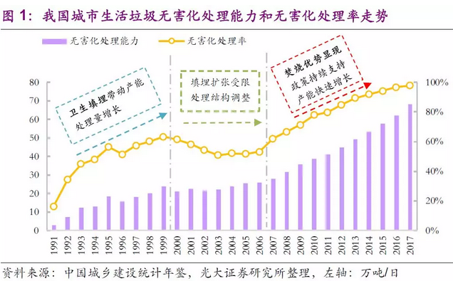 衛(wèi)生填埋技術(shù)在固廢行業(yè)發(fā)展初期帶動無害化處理能力的提升。我國固廢行業(yè)的發(fā)展是伴隨著城鎮(zhèn)化率提升、個人消費(fèi)的需求而起的。行業(yè)發(fā)展初期(2000年前),無害化處理技術(shù)相對落后,投資有限,衛(wèi)生填埋技術(shù)憑借其適用范圍廣、技術(shù)簡單、單位投資和處理成本相對較低的優(yōu)勢,在這個時期引領(lǐng)了行業(yè)的發(fā)展。