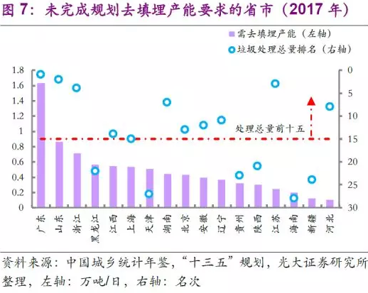 去填埋產(chǎn)能任務(wù)在產(chǎn)廢大省進(jìn)展受阻?!笆濉币?guī)劃中同時有著去填埋產(chǎn)能的要求。由于我國垃圾產(chǎn)生量持續(xù)增長,在焚燒產(chǎn)能仍處于爬坡期時,為了完成無害化處置的要求,全國衛(wèi)生填埋處理能力從2015年的50.15萬噸/日進(jìn)一步增長至2017年的52.59萬噸/日,距規(guī)劃要求的47.71萬噸/日仍有不少差距。去填埋產(chǎn)能任務(wù)較重的多為產(chǎn)廢大省(廣東、山東、浙江等),且其去填埋產(chǎn)能缺口和垃圾焚燒產(chǎn)能提升缺口呈現(xiàn)一定的相關(guān)性。