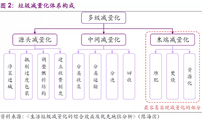 “全過程多級減量”是最適合我國可持續(xù)發(fā)展基本思想的垃圾減量化體現(xiàn)形式。“全過程多級減量”通過從垃圾體系的源頭、中間、末端等三方面的全面控制用以實現(xiàn)減少固體廢物產(chǎn)生這一核心要素,而其中最容易優(yōu)先實現(xiàn)減量化的部分是末端的減量化。
