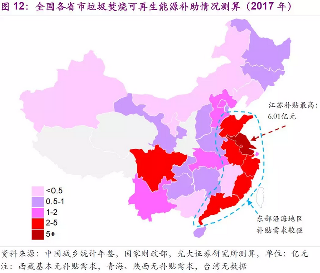 進(jìn)一步分析,垃圾焚燒產(chǎn)能充足,實際處理量較多的東部沿海地區(qū)在2017年的補(bǔ)貼需求較強(qiáng),江蘇的城鎮(zhèn)垃圾焚燒處理量居全國第一,所需補(bǔ)貼金額達(dá)6.01億元;山東、浙江、廣東、福建、安徽、四川的城鎮(zhèn)垃圾焚燒處理量位列2~7位,也是另外6個補(bǔ)貼需求超2億元的省份。