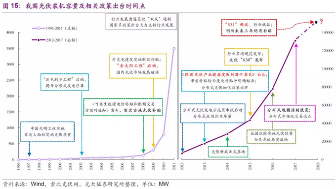 和新能源汽車行業(yè)類似,我國光伏行業(yè)的高速發(fā)展同樣離不開政府政策的大力支持和財政補(bǔ)貼的持續(xù)幫助。我國光伏裝機(jī)容量的高增速起點(diǎn)便是2008年《2008年7月~12月可再生能源電價補(bǔ)貼和配額交易方案的通知》的發(fā)布,首次實施光伏補(bǔ)貼。2012年我國遭遇美歐“雙反”政策后,國家持續(xù)出臺多項政策和補(bǔ)貼細(xì)則支持光伏行業(yè)的發(fā)展,帶動我國新增光伏裝機(jī)容量自2013年起連續(xù)五年位居全球第一,2017年光伏裝機(jī)容量已達(dá)131GW(全球第一)。