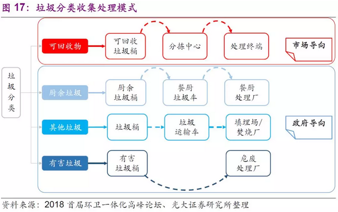 (3)收集精細(xì)化,推動再生資源行業(yè)的發(fā)展。再生資源回收利用行業(yè)原本也是政府大力推進(jìn)的固廢處理板塊,是實現(xiàn)垃圾處理“資源化”目標(biāo)的最有效手段。但是行業(yè)發(fā)展受阻的重要原因之一便是垃圾分類制度的不健全,導(dǎo)致拾荒者、黑市等現(xiàn)象頻出,行業(yè)劣質(zhì)公司騙補(bǔ)情況嚴(yán)重,導(dǎo)致行業(yè)發(fā)展緩慢。垃圾分類的全面實施可以提高前端垃圾收集的精細(xì)化程度,更能進(jìn)一步推進(jìn)再生資源和生活垃圾網(wǎng)絡(luò)的“兩網(wǎng)融合”,推動再生資源行業(yè)的發(fā)展。