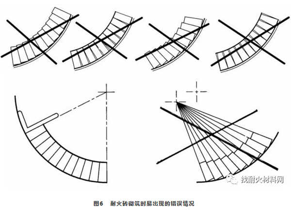 (3)砌筑時需保證耐火磚貼緊窯體內(nèi)壁,各耐火磚側(cè)面之間(環(huán)向)相互貼緊,隨時用橡皮錘或木錘敲擊找正來保證這兩項貼緊;不時檢查各環(huán)縫是否與環(huán)向基準線平行,耐火磚的徑向方向線是否與窯體同心,各環(huán)耐火磚間不能存在“臺階”現(xiàn)象,磚縫不能出現(xiàn)楔形磚縫,如圖6所示:
