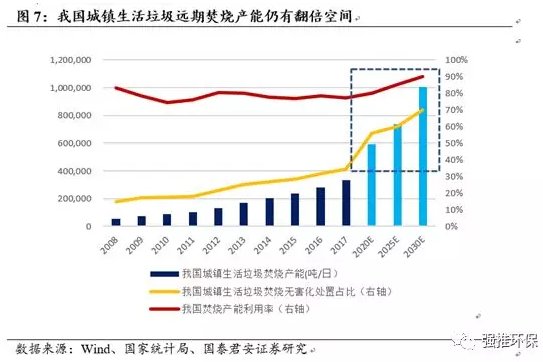 近期看,根據(jù)“十三五”規(guī)劃,我們測算2020年我國城鎮(zhèn)生活垃圾焚燒處理率將達56%。我們假設(shè),1)2020年末我國城鎮(zhèn)生活垃圾產(chǎn)能達到“十三五”規(guī)劃數(shù)據(jù),2)2018-2020年城市及縣城垃圾清運量分別按照每年5%、1.5%的速度增長,3)2018-2020年城市及縣城垃圾無害化處置率分別保持98%、91%,4)到2020年城鎮(zhèn)生活垃圾焚燒產(chǎn)能利用率達到80%,則可測算出到2020年我國城鎮(zhèn)生活垃圾焚燒處理率將達56%。