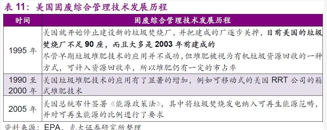 成熟技術(shù)為固廢綜合管理發(fā)展提供有力支撐。固廢行業(yè)的技術(shù)發(fā)展同樣是制約市場和公司發(fā)展的另一個決定性因素。早在1940年,美國公共衛(wèi)生署(USPHS)便開始推行了一系列固廢處置的技術(shù)性試驗,從“衛(wèi)生填埋代替露天堆放”,到“垃圾堆肥的探索和試驗”,再到“垃圾焚燒”,最后到了如今大力推廣的“廢物能源回收”的綜合利用。