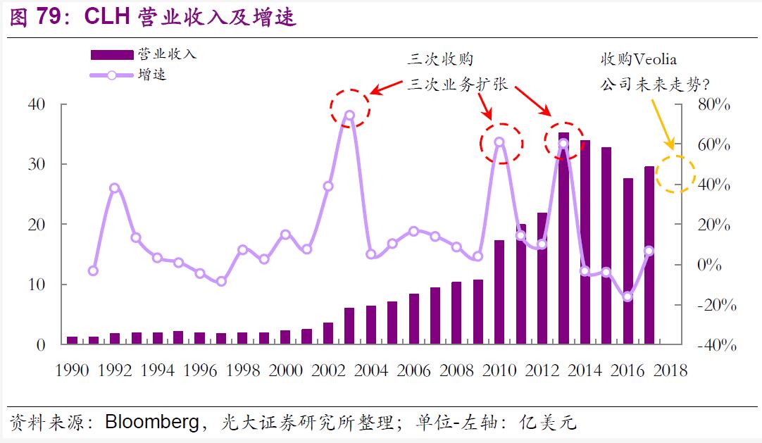 公司在成立后的近40年里,通過大大小小近40余次外延并購,在增加危險廢物處理設(shè)施的數(shù)量和覆蓋區(qū)域、擴大業(yè)務(wù)服務(wù)范圍的同時,也致力于增添新的涵蓋多個行業(yè)和業(yè)務(wù)類型的服務(wù)領(lǐng)域、擴大服務(wù)種類,最終從一家小型油罐清潔公司成長為北美領(lǐng)先的環(huán)境和工業(yè)服務(wù)提供商和最大的危險廢物處理公司。
