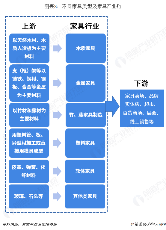 根據(jù)《國(guó)民經(jīng)濟(jì)產(chǎn)業(yè)分類》中,家具制造業(yè)是指用木材、金屬、塑料、竹、藤等材料制作的,具有坐臥、憑倚、儲(chǔ)藏、間隔等功能,可用于住宅、旅館、辦公室、學(xué)校、餐館、醫(yī)院、劇場(chǎng)、公園、船艦、飛機(jī)、機(jī)動(dòng)車等任何場(chǎng)所的各種家具的制造。按照家具其主要使用材料進(jìn)行分類,包括木質(zhì)家具、金屬家具、竹藤家具、塑料家具及其他家具類型,其對(duì)應(yīng)的下游包括家具賣(mài)場(chǎng)、品牌實(shí)體店、超市、百貨商場(chǎng)、展會(huì)及線上銷售等。