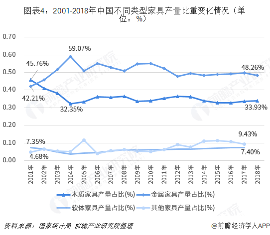 從2001-2018年中國(guó)不同類型家具產(chǎn)量占比變化情況看,中國(guó)生產(chǎn)的家具以木質(zhì)家具和金屬家具為主,軟體家具、竹藤類家具、塑料家具等所占比重較??;2001年以后,金屬家具產(chǎn)量比重就超過(guò)了木質(zhì)家具,金屬家具產(chǎn)量比重基本保持在50%上下,木質(zhì)家具產(chǎn)量比重保持在35%上下。