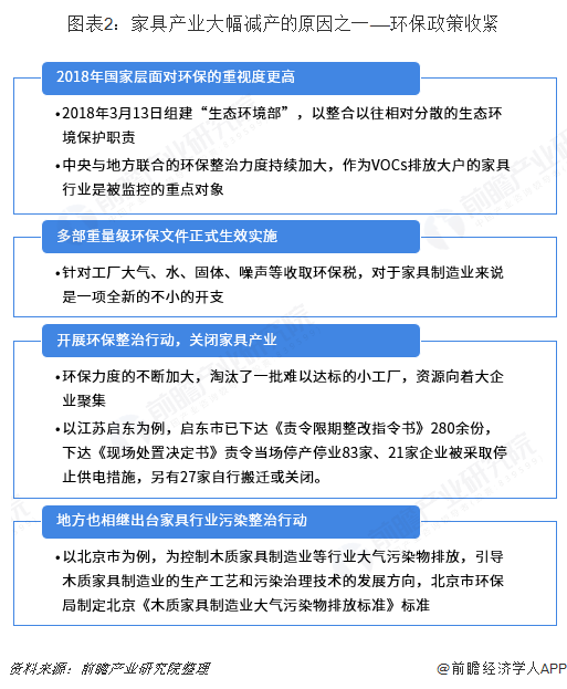 2018年家具產(chǎn)量大幅減產(chǎn)的原因之一是環(huán)保政策的陸續(xù)出臺(tái)。環(huán)保政策的收緊,國(guó)家及地區(qū)對(duì)木質(zhì)家具企業(yè)的污染問(wèn)題、甲醛問(wèn)題等陸續(xù)進(jìn)入進(jìn)入整治階段,中小家具企業(yè)陸續(xù)倒閉,家具行業(yè)數(shù)量減少,導(dǎo)致全國(guó)總產(chǎn)量減少。2018年國(guó)家層面對(duì)環(huán)保的重視度更高:2018年3月13日組建“生態(tài)環(huán)境部”,以整合以往相對(duì)分散的生態(tài)環(huán)境保護(hù)職責(zé);中央與地方聯(lián)合的環(huán)保整治力度持續(xù)加大,作為VOCs排放大戶的家具行業(yè)是被監(jiān)控的重點(diǎn)對(duì)象;多部重量級(jí)環(huán)保文件正式生效實(shí)施:針對(duì)大氣污染治理、水污染治理、固廢污染治理、噪聲污染治理等收取環(huán)保稅,對(duì)于家具制造業(yè)來(lái)說(shuō)是一項(xiàng)全新的不小的開(kāi)支。環(huán)保力度的不斷加大,淘汰了一批難以達(dá)標(biāo)的小工廠,資源向著大企業(yè)聚集;以江蘇啟東為例,啟東市已下達(dá)《責(zé)令限期整改指令書(shū)》280余份,下達(dá)《現(xiàn)場(chǎng)處置決定書(shū)》責(zé)令當(dāng)場(chǎng)停產(chǎn)停業(yè)83家、21家企業(yè)被企業(yè)被采取停止供電措施,另有27家自行搬遷或關(guān)閉……