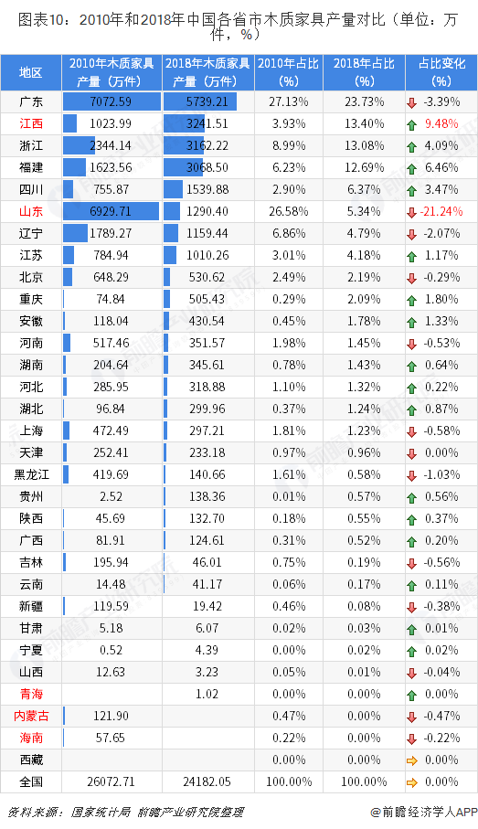 第二,與2010年相比,2018年全國(guó)木質(zhì)家具產(chǎn)量有所降低,但是大部分地區(qū)的產(chǎn)量有所增加,如江西、浙江、福建、四川等地區(qū);這主要是由于廣東和山東的木質(zhì)家具產(chǎn)量大幅下降,尤其是山東??;2010年山東和廣東的木質(zhì)家具產(chǎn)量份額均在27%上下,但是2018年山東省產(chǎn)量份額下降至5.34%。