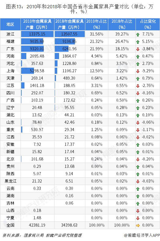 選取2010年和2018年兩個(gè)時(shí)間節(jié)點(diǎn),通過(guò)對(duì)比兩個(gè)時(shí)間節(jié)點(diǎn)各省市金屬家具產(chǎn)量絕對(duì)量和相對(duì)量變化情況探索金屬家具產(chǎn)業(yè)遷移路徑。據(jù)國(guó)家統(tǒng)計(jì)局?jǐn)?shù)據(jù),截至到2018年,海南、西藏、甘肅、青海和內(nèi)蒙古等地區(qū)暫無(wú)金屬家具產(chǎn)業(yè)布局。浙江地區(qū)的原材料相關(guān)產(chǎn)業(yè)發(fā)展基礎(chǔ)推動(dòng)金屬家具產(chǎn)業(yè)發(fā)展。