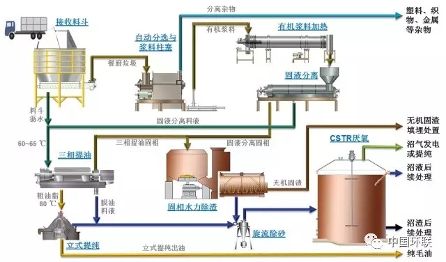 工藝核心:“精細(xì)化預(yù)處理+高效油水分離”,通過機(jī)械分選,確保進(jìn)入提油系統(tǒng)的有機(jī)物料均質(zhì)化,通過機(jī)械離心的方式最大程度提取出廢油脂,漿料則進(jìn)入后端厭氧系統(tǒng)產(chǎn)沼。