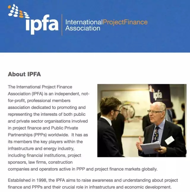 國(guó)際項(xiàng)目融資協(xié)會(huì)(IPFA)是于 1998 年 11 月在倫敦成立的非盈利性國(guó)際機(jī)構(gòu),在全球有超過(guò)600家的機(jī)構(gòu)會(huì)員,是全球最大的聚焦項(xiàng)目融資和PPP的專(zhuān)業(yè)網(wǎng)絡(luò)和交流平臺(tái)。其會(huì)員多是基礎(chǔ)設(shè)施建設(shè)和能源行業(yè)的主要參與者,包括金融機(jī)構(gòu)、項(xiàng)目發(fā)起人、律師事務(wù)所、建筑公司以及從事PPP項(xiàng)目的運(yùn)營(yíng)商。