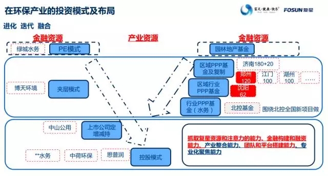 戴海峰在《環(huán)保投資熱下的冷思考》演講中提出:“環(huán)保+”成為當下中國資本市場風(fēng)口之一,超過500億市值的環(huán)保上市公司已經(jīng)出現(xiàn);“復(fù)星集團投的不僅僅是錢,更多的是多資源對接、上下游合作等,從而創(chuàng)造更多的產(chǎn)業(yè)協(xié)同價值?!碧岢鲋挥挟a(chǎn)業(yè)整合,利用大資金、大平臺、強團隊、大生態(tài)才能創(chuàng)造機會和價值。