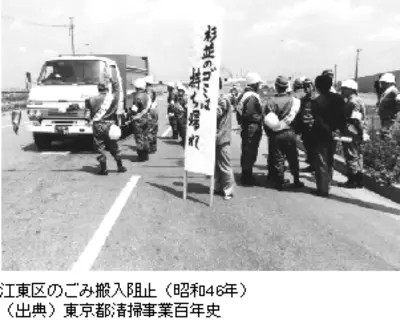 另一方面,江東區(qū)政府和區(qū)民也慢慢意識(shí)到,都政府關(guān)于垃圾填埋到1970年為止的承諾,根本沒(méi)有實(shí)現(xiàn)的可能性。到了1971年,平均每天有5000輛以上的搬運(yùn)車,將東京中心23區(qū)所生產(chǎn)的垃圾中的70%搬運(yùn)到江東區(qū)進(jìn)行填埋。由此產(chǎn)生的交通堵塞、蚊蟲(chóng)叢生、空氣污染甚至是火災(zāi),給江東區(qū)區(qū)民的日常生活造成重大困擾。