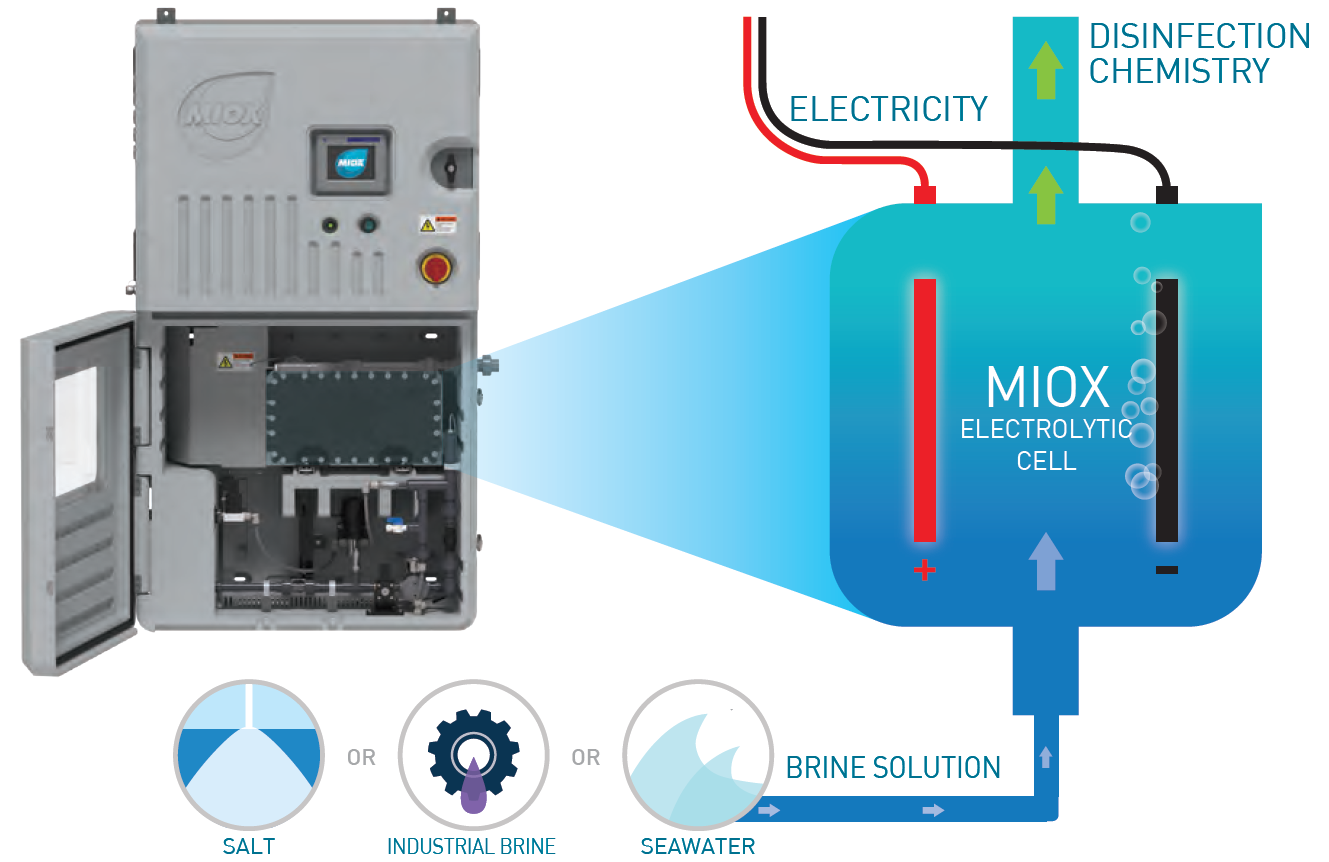 迪諾拉MIOX技術能現(xiàn)場制備混合氧化物溶液,并針對更具有挑戰(zhàn)性的應用進行了優(yōu)化。這種混合氧化物溶液具有次氯酸鈉的所有氧化能力,同時具有過氧化氫的額外處理優(yōu)勢,包括穿透去除生物膜、有害消毒副產(chǎn)品的減少,改善氣味以及水的澄清度。此外,MIOX所具備的自清洗等獨特功能,能幫助客戶通過更低的加藥量保持更穩(wěn)定的控制和余氯濃度。