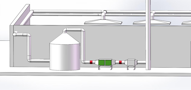 針對這種工況,草木綠設計的凈化方案是,淬火爐、回火爐廢氣在收集后,經(jīng)噴淋塔洗滌,再通過草木綠自主研發(fā)設計的雙極靜電式油霧凈化器進行集中過濾,最后經(jīng)煙囪達標排放。考慮到熱處理工序產生的廢氣帶有火苗,所以,草木綠設計加裝了防火罩、防火閥等防火措施。廢氣先經(jīng)噴淋塔洗滌,也能起到防火作用。