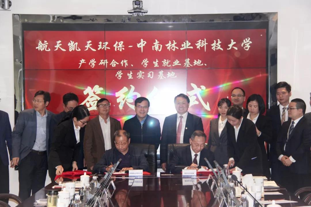 2019年11月6日,航天凱天環(huán)??萍脊煞萦邢薰九c中南林業(yè)科技大學(xué)在航天凱天工業(yè)園內(nèi)成功簽訂產(chǎn)學(xué)研合作協(xié)議,學(xué)生就業(yè)、實(shí)習(xí)基地協(xié)議。中南林業(yè)科技大學(xué)黨委書記王漢青、環(huán)境科學(xué)與工程學(xué)院院長王平、科技處副處長付紅軍等,航天凱天環(huán)??偛萌~明強(qiáng)、副總裁曾毅夫、總裁助理伍蕓昕等出席簽約儀式,總裁助理葉明強(qiáng)主持會(huì)議。