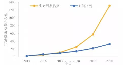 對于“十三五”期間土壤修復(fù)市場的預(yù)測,利用生命周期估算和時間序列法進(jìn)行分析。根據(jù)生命周期估算法預(yù)測在整個“十三五”期間市場總額約為2297億元,是較為激進(jìn)樂觀的情況;根據(jù)利用時間序列法預(yù)測“十三五”期間市場總額約為849億元,是相對保守的情況,如圖5所示。
