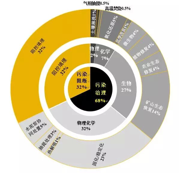 根據(jù)江蘇?。ㄒ伺d)環(huán)保產(chǎn)業(yè)技術(shù)研究院及土盟對公開招投標(biāo)項(xiàng)目的統(tǒng)計調(diào)查發(fā)現(xiàn),2008-2016年,我國177個土壤修復(fù)項(xiàng)目中,土壤修復(fù)以污染介質(zhì)治理技術(shù)為主,占比68%;污染途徑阻斷技術(shù)占比32%。在污染介質(zhì)治理技術(shù)中,物理化學(xué)和生物技術(shù)成為主要技術(shù),分別占比32%和27%;物理、化學(xué)單一類技術(shù)應(yīng)用占比相對較小,分別為2%和7%(圖 1)。
