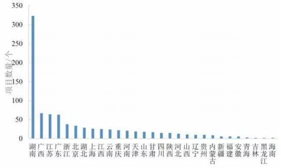 從目前所采集到的數(shù)據(jù)來看,已有29 個?。ㄗ灾螀^(qū)、直轄市)發(fā)布過土壤修復(fù)項(xiàng)目,如圖 4 所示。在發(fā)布項(xiàng)目的數(shù)量上,湖南、廣西、廣東、江蘇、浙江、北京各地較為領(lǐng)先,其中湖南省土壤修復(fù)項(xiàng)目數(shù)量居全國首位。