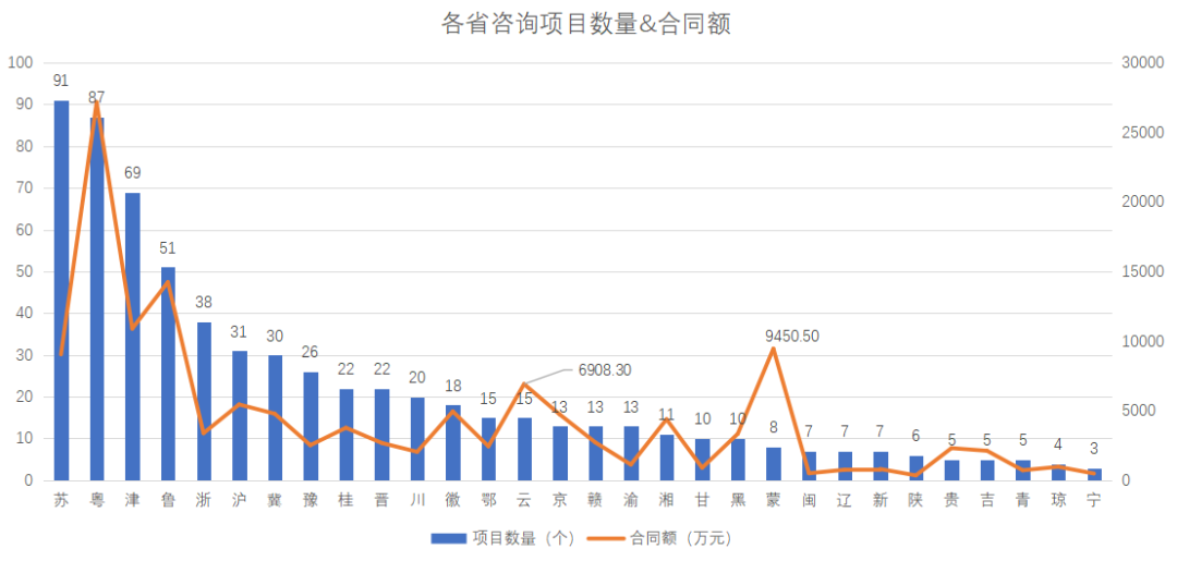 圖2 各省區(qū)市咨詢(xún)項(xiàng)目數(shù)量與合同額情況