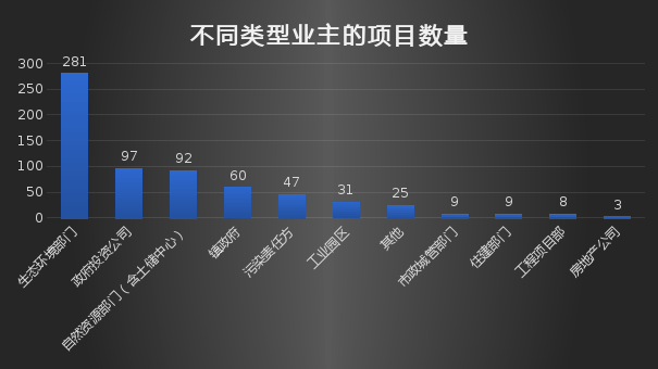 (2)政府投資公司,產(chǎn)生了第二多的項(xiàng)目,業(yè)務(wù)模式大多是作為政府融資平臺(tái)牽頭進(jìn)行地塊開(kāi)發(fā),土地流轉(zhuǎn)資金支持修復(fù)工作。