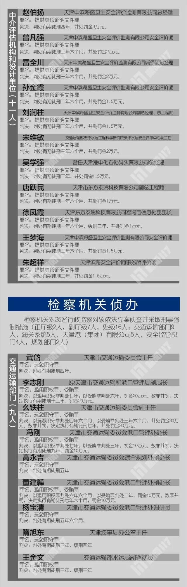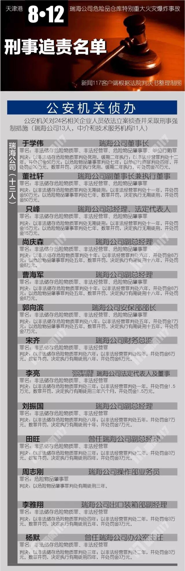 根據(jù)各被告人犯罪的事實(shí)、性質(zhì)、情節(jié)和造成的社會(huì)危害后果以及在共同犯罪中的地位、作用,法院依法作出一審判決。瑞海公司董事長(zhǎng)于學(xué)偉構(gòu)成非法儲(chǔ)存危險(xiǎn)物質(zhì)罪、非法經(jīng)營(yíng)罪、危險(xiǎn)物品肇事罪、行賄罪,予以數(shù)罪并罰,依法判處死刑緩期二年執(zhí)行,并處罰金人民幣70萬(wàn)元;瑞海公司副董事長(zhǎng)董社軒、總經(jīng)理只峰等5人構(gòu)成非法儲(chǔ)存危險(xiǎn)物質(zhì)罪、非法經(jīng)營(yíng)罪、危險(xiǎn)物品肇事罪,分別被判處無(wú)期徒刑到十五年有期徒刑不等的刑罰;瑞海公司其他7名直接責(zé)任人員分別被判處十年到三年有期徒刑不等的刑罰。中濱安評(píng)公司犯提供虛假證明文件罪,依法判處罰金25萬(wàn)元:中濱安評(píng)公司董事長(zhǎng)、總經(jīng)理趙伯揚(yáng)等11名直接責(zé)任人員分別被判處四年到一年六個(gè)月不等的有期徒刑。天津市交通運(yùn)輸委員會(huì)主任武岱等25名國(guó)家機(jī)關(guān)工作人員分別被以玩忽職守罪或?yàn)E用職權(quán)罪判處三年到七年不等的有期徒刑,其中李志剛等8人同時(shí)犯受賄罪,予以數(shù)罪并罰。