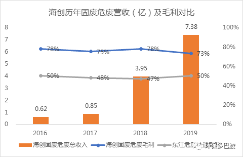 注:上述海創(chuàng)統(tǒng)計(jì)數(shù)據(jù)包含少量協(xié)同處置一般固廢業(yè)務(wù),但占比較小,例如2019年危廢處置營(yíng)收6.16億,一般固廢收入1.22億。因此海創(chuàng)危廢毛利實(shí)際更高,例如2018年海創(chuàng)協(xié)同處置危廢的平均價(jià)格2260元/噸,遠(yuǎn)低于傳統(tǒng)焚燒及填埋處置費(fèi)用,危廢處置毛利率超80%。