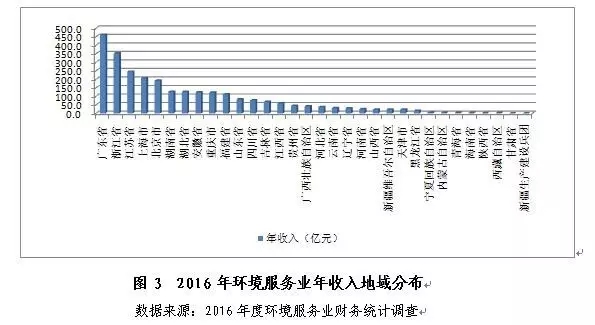 2016年,環(huán)境服務(wù)業(yè)在全國(guó)各地均有分布,且具有較高的區(qū)域集中度。54%以上的年收入來自于排名前5的地區(qū),僅2%來自排名最后的10個(gè)?。ㄗ灾螀^(qū)、直轄市),分布格局與2015年基本一致。