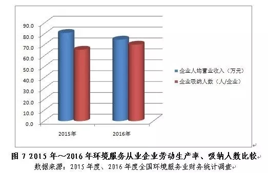 2016年,環(huán)境服務(wù)從業(yè)企業(yè)人均營(yíng)業(yè)收入74.8萬元,同比下跌7.5%。從業(yè)企業(yè)勞動(dòng)生產(chǎn)率的小幅下滑可能與企業(yè)吸納從業(yè)人數(shù)的增長(zhǎng)有關(guān),2016年業(yè)內(nèi)企業(yè)平均吸納人數(shù)為70人/企業(yè),同比提高7.2%。