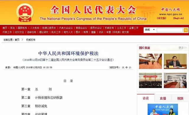 2016年12月25日,曾走過6年立法之路、歷經(jīng)兩次審議的《中華人民共和國環(huán)境保護稅法》終于由第十二屆全國人民代表大會常務(wù)委員會第二十五次會議通過。習(xí)近平簽發(fā)中華人民共和國第六十一號主席令予以公布,新法自2018年1月1日起施行。