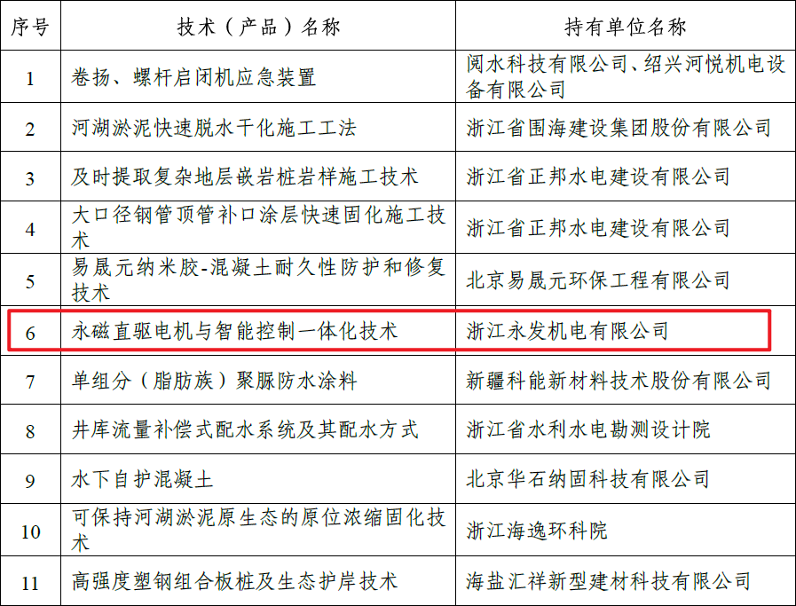 永發(fā)機(jī)電永磁直驅(qū)電機(jī)與智能控制一體化技術(shù)入選2020浙江水利工程建設(shè)新技術(shù)推廣應(yīng)用清單