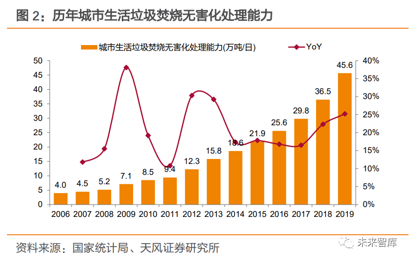 1.1. 新增產(chǎn)能增速放緩+垃圾分類(lèi)推行,市場(chǎng)擔(dān)憂行業(yè)成長(zhǎng)性近年來(lái),我國(guó)垃圾焚燒發(fā)電產(chǎn)業(yè)步入快速發(fā)展軌道。以城市為例,生活垃圾焚燒處理廠由2006年69座增長(zhǎng)至2019年389座,焚燒處理能力由2006年4.0萬(wàn)噸/日上升至2019年45.6萬(wàn)噸/日,提升約10倍。產(chǎn)能擴(kuò)增帶動(dòng)下,城市生活垃圾焚燒處置量由2006年0.11億噸提升至 2019 年 1.22 億噸,占無(wú)害化處置量的比例也由 2006 年 14%提升至 2019年51%。縣城垃圾焚燒產(chǎn)業(yè)也在積極推進(jìn),據(jù)住建部最新數(shù)據(jù),2018年縣城焚燒處置量占比達(dá)17%,較2006年提升16%。