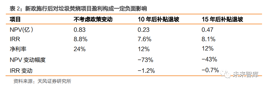 垃圾分類(lèi)制度逐步推行,加劇市場(chǎng)憂慮。2019 年 4 月,《關(guān)于在全國(guó)地級(jí)及以上城市全面開(kāi)展生活垃圾分類(lèi)工作的通知》發(fā)布,全國(guó)地級(jí)及以上城市全面啟動(dòng)生活垃圾分類(lèi)工作。2020 年 12 月,住建部表示 46 個(gè)重點(diǎn)城市已基本建成生活垃圾分類(lèi)系統(tǒng)。由于垃圾分類(lèi)可將不同種類(lèi)的生活垃圾,分別進(jìn)行投放、收集、運(yùn)輸直至處理處置,市場(chǎng)擔(dān)心隨著垃圾 分類(lèi)制度進(jìn)一步推行,濕垃圾、可回收垃圾等資源化利用量提高,生活垃圾焚燒處置量會(huì) 有所下滑。例如,上海在實(shí)行分類(lèi)政策后,2019 年日均干垃圾處置量 17731 噸,較 2018 年底減少 17.5%。1.2. 國(guó)補(bǔ)靴子落地,垃圾焚燒企業(yè)盈利性短期承壓電價(jià)補(bǔ)貼是垃圾焚燒廠重要收入來(lái)源之一。為支持可再生能源,我國(guó)依據(jù)《可再生能源法》,對(duì)可再生能源采用固定電價(jià)政策,電價(jià)差異由國(guó)家專(zhuān)門(mén)設(shè)立的可再生能源電價(jià)附加補(bǔ)足。以垃圾焚燒發(fā)電項(xiàng)目為例,政策規(guī)定全國(guó)統(tǒng)一垃圾發(fā)電標(biāo)桿電價(jià)0.65 元/Kwh,高出當(dāng)?shù)孛摿蛉济簷C(jī)組標(biāo)桿上網(wǎng)電價(jià)(0.35 元/Kwh 左右)的部分,實(shí)行兩級(jí)分?jǐn)?,?dāng)?shù)厥〖?jí)電網(wǎng)負(fù)擔(dān) 0.1 元/Kwh,其余由可再生能源電價(jià)附加解決。目前可再生能源補(bǔ)貼工作正有序推進(jìn), 包括垃圾發(fā)電項(xiàng)目在內(nèi)的存量生物質(zhì)項(xiàng)目正逐步納入補(bǔ)貼清單,2020 年新增生物質(zhì)項(xiàng)目清單也于 2020 年 11 月公布,共有 46 個(gè)新增垃圾發(fā)電項(xiàng)目納入 2020 年補(bǔ)貼清單,裝機(jī)規(guī)模 1163MW。國(guó)補(bǔ)靴子落地,將“合理利用小時(shí)數(shù)”作為補(bǔ)貼發(fā)放測(cè)算標(biāo)準(zhǔn)。2020 年 9 月,三部委發(fā)布《關(guān)于<關(guān)于促進(jìn)非水可再生能源發(fā)電健康發(fā)展的若干意見(jiàn)>有關(guān)事項(xiàng)的補(bǔ)充通知》。《通知》確定各類(lèi)項(xiàng)目全生命周期合理利用小時(shí)數(shù),在合理利用小時(shí)的基礎(chǔ)上,項(xiàng)目全生命周期補(bǔ)貼電量=項(xiàng)目容量×項(xiàng)目全生命周期合理利用小時(shí)數(shù)。其中,項(xiàng)目容量按核準(zhǔn)(備案)時(shí)確定的容量為準(zhǔn)。如項(xiàng)目實(shí)際容量小于核準(zhǔn)(備案)容量的,以實(shí)際容量為準(zhǔn)。新政施行后對(duì)垃圾焚燒項(xiàng)目盈利構(gòu)成一定負(fù)面影響。我們對(duì)一個(gè)日處置量 1000 噸的垃圾焚燒項(xiàng)目進(jìn)行了測(cè)算,新政施行后,假設(shè)在項(xiàng)目運(yùn)營(yíng)滿(mǎn) 15 年后,標(biāo)桿上網(wǎng)電價(jià)按 0.45 元 /度確認(rèn),項(xiàng)目的 IRR/NPV 將分別減少 0.7%/43%;而對(duì)于優(yōu)質(zhì)的垃圾焚燒項(xiàng)目,其利用小時(shí)數(shù)較高,假設(shè)其運(yùn)營(yíng) 10 年后已滿(mǎn)足 82500 的全生命周期合理利用小時(shí)數(shù),從第 11 年 起,標(biāo)桿上網(wǎng)電價(jià)按 0.45 元/度確認(rèn),則項(xiàng)目的 IRR/NPV 將分別減少 1.2%/73%。從凈利率的角度,按 0.45 元/度確認(rèn)標(biāo)桿上網(wǎng)電價(jià)后,項(xiàng)目?jī)衾蕦⒔档?12 %左右。
