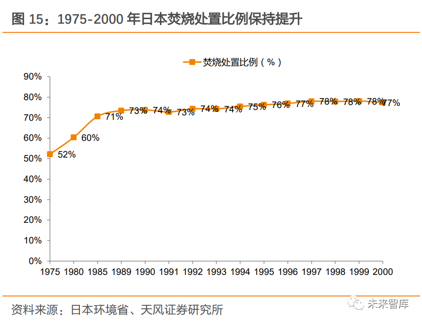 1.3. 補(bǔ)貼退坡已被市場(chǎng)消化,期待垃圾發(fā)電企業(yè)的破局之道補(bǔ)貼退坡影響已被市場(chǎng)消化,板塊估值處于歷史低位。近兩年,市場(chǎng)對(duì)垃圾焚燒補(bǔ)貼退坡的擔(dān)憂一直成為壓制板塊估值的重要因素之一,垃圾焚燒企業(yè)表現(xiàn)近年弱于市場(chǎng)。2020 年 9 月 29 日,《關(guān)于<關(guān)于促進(jìn)非水可再生能源發(fā)電健康發(fā)展的若干意見(jiàn)>有關(guān)事項(xiàng)的補(bǔ)充通知》發(fā)布,更是加劇了市場(chǎng)對(duì)焚燒發(fā)電企業(yè)的盈利性和成長(zhǎng)性的擔(dān)憂,造成短期板塊的明顯下挫。9 月 29 日至今,垃圾焚燒(長(zhǎng)江)指數(shù)下降 12.3%;而同期上證綜指上漲 1.8%, 大幅跑輸市場(chǎng) 14.1 個(gè)百分點(diǎn)。從估值層面看,截至最新,我們選取的 8 家垃圾焚燒發(fā)電企業(yè),綜合市盈率 19 倍,處歷史低位。我們認(rèn)為垃圾焚燒發(fā)電企業(yè)仍有成長(zhǎng)及盈利優(yōu)化空間。我國(guó)垃圾焚燒企業(yè)運(yùn)營(yíng)收入包括上網(wǎng)電費(fèi)收入及垃圾處理服務(wù)費(fèi)收入,占比大致為 7:3。發(fā)電收入中,噸上網(wǎng)電量受入爐垃圾熱值、技術(shù)工藝、廠用電率等因素影響;上網(wǎng)電價(jià)受政策調(diào)控,由當(dāng)?shù)孛摿蛉济簷C(jī)組標(biāo) 桿上網(wǎng)電價(jià)、省級(jí)電網(wǎng)負(fù)擔(dān)和國(guó)家可再生能源電價(jià)附加基金負(fù)擔(dān)三部分構(gòu)成。垃圾處置費(fèi)根據(jù)噸垃圾處置單價(jià)(競(jìng)標(biāo)決定)和處理量確定,由項(xiàng)目所在地政府支付。本篇報(bào)告將從行業(yè)成長(zhǎng)性(與焚燒處理量相關(guān)),以及垃圾發(fā)電企業(yè)盈利性(與企業(yè)財(cái)務(wù)狀況、噸上網(wǎng) 電量、噸垃圾處理費(fèi)單價(jià)相關(guān))兩方面出發(fā),解析國(guó)補(bǔ)退坡及垃圾分類(lèi)背景下,為何依舊 看好行業(yè)的發(fā)展前景。2. 成長(zhǎng)性方面,國(guó)內(nèi)垃圾焚燒市場(chǎng)仍大有可為2.1. 復(fù)盤(pán)國(guó)外:焚燒處置量趨穩(wěn),分類(lèi)制度并未產(chǎn)生明顯減量效果2.1.1. 日本:焚燒是垃圾處置主流方式,多年占比超 70%1980s 開(kāi)始,日本大規(guī)模實(shí)施垃圾分類(lèi),并未造成焚燒處置量下降。1960s,在經(jīng)濟(jì)高速發(fā)展背景下,日本多個(gè)地區(qū)垃圾處置產(chǎn)能與處置需求間存在較大缺口,政府加大焚燒處置推進(jìn)力度,垃圾焚燒產(chǎn)業(yè)得到快速擴(kuò)張。1975 年-2000 年,日本垃圾焚燒處置比例由 52.20% 逐步提升至 77.40%,焚燒比例快速提升。這個(gè)過(guò)程伴隨著經(jīng)濟(jì)增長(zhǎng)帶來(lái)的人均垃圾產(chǎn)量的持續(xù)增長(zhǎng),和垃圾分類(lèi)從 1980s 開(kāi)始大規(guī)模實(shí)施。事實(shí)上,1980-2000 年期間,日本垃圾分類(lèi)造成的資源化比例提升,并未造成焚燒處置量的下降,焚燒量和焚燒處置比例持續(xù)保持正增長(zhǎng)。